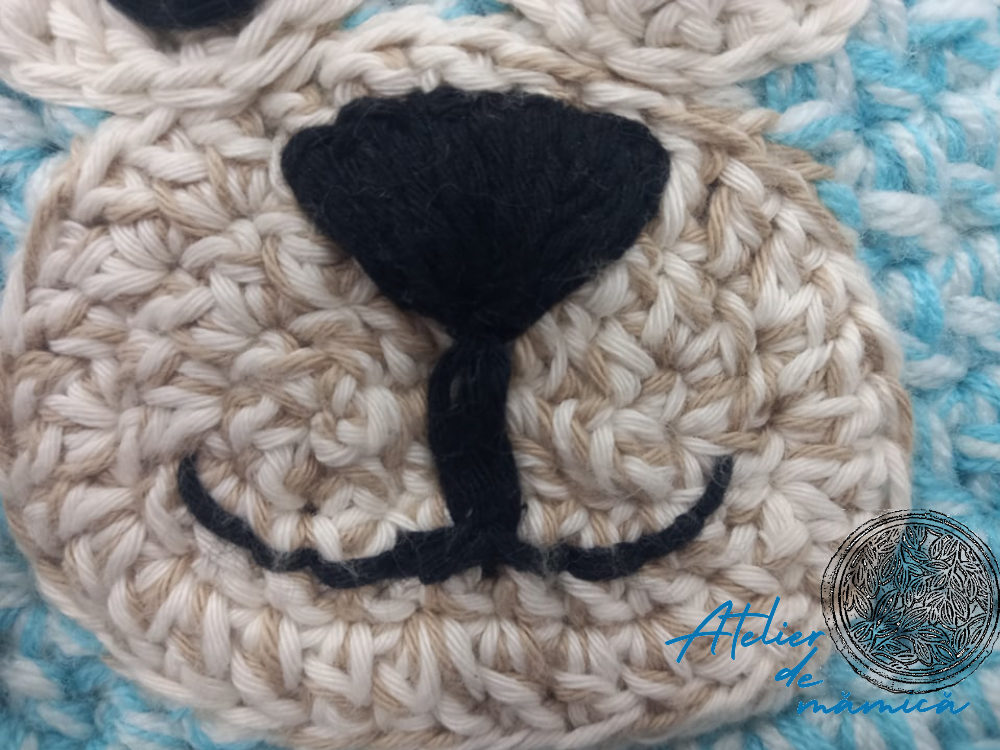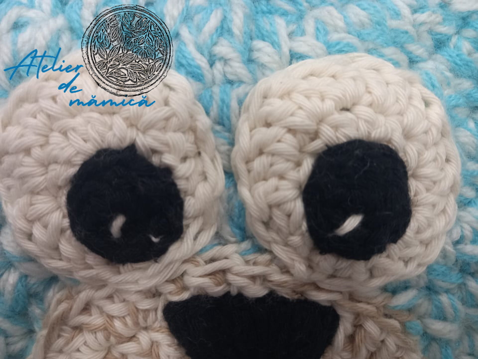 Pentru a crea nasul și gura am utilizat bumbac negru și am brodat pe suprafața boticului croșetat anterior.